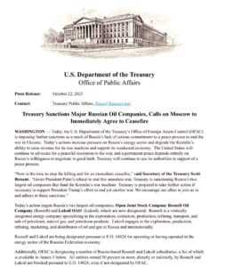 აშშ-ის ფინანსთა სამინისტროს საზოგადოებასთან ურთიერთობის ოფისმა გამოაქვეყნა გადაწყვეტილება რუსული ნავთობკომპანიების სანქცირების შესახებ. ფინანსთა სამინისტრო სანქციებს უწესებს რუსულ ნავთობის მსხვილ კომპანიებს და მოუწოდებს მოსკოვს, დაუყოვნებლივ დაეთანხმოს ცეცხლის შეწყვეტას