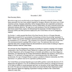 აშშ-ის სენატის საგარეო ურთიერთობათა კომიტეტისა წევრებმა წერილით მიმართეს სახელმწიფო მდივან მარკო რუბიოს, რათა მან გამოიყენოს ყველა არსებული ბერკეტი საქართველოს ხელისუფლების მხრიდან ამერიკის თანამშრომლებზე თავდასხმების შესაჩერებლად.