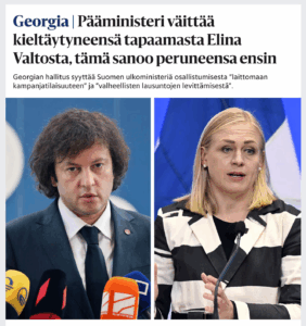 “ვალტონენმა HS-ს ტელეფონით უთხრა, რომ პრემიერ-მინისტრ კობახიძესთან შეხვედრა არა საქართველოს ინიციატივით, არამედ ფინეთის ინიციატივით გაუქმდა გრაფიკის ცვლილების გამო და ამის შესახებ ქართველებს გუშინ ღამით აცნობეს”. – წერს გამოცემა.