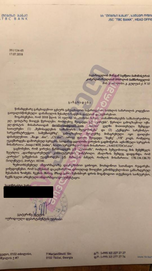 როგორც წერილებიდან ირკვევა, თიბისი ბანკზე კიბერშეტევის მცდელობას ადგილი 2018 წლის 16 ივლისს ჰქონდა, რის შესახებაც ბანკმა შსს-ს 17 ივლისს აცნობა.პირველი წერილით ბანკი შსს–ს სწორედ ვირუსების შემცველი კორესპოდენციის
